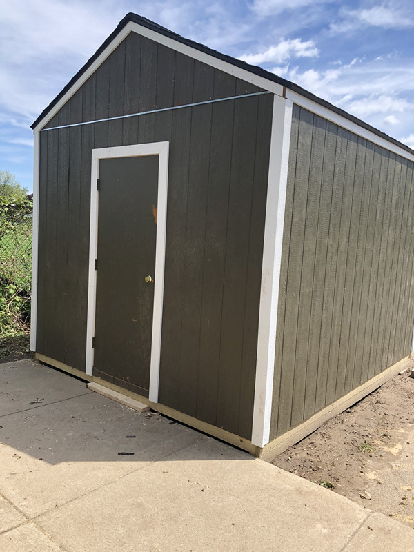 A small shed was in place before this project. It is used by people who want to leave donations of clothes for the Clothing Closet. The donations shed was given a new roof, and a new look, so that it matched the new storage shed. This came as a total surprise to us and very much appreciated.